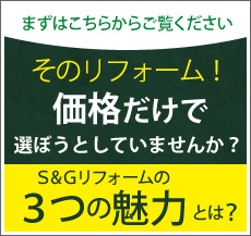 | 住まいのスタートからゴールまで こんにちは!S&Gリフォームです。 S&Gリフォームは無機質な住空間をいかにすれば「愛に囲まれた潤いの空間」に変身できるのかという「テーマ」に本気で取り組み、とことんこだわり「住みたくなる家」を追求してきました。 全面のリフォームから小さなリフォームまで、きっと皆様の力になることができると思います。 住まいのスタートからゴールまで、S&Gリフォームは時を重ねてもずっと愛される家を追及し、これからも皆さまのご支援を得て益々進化をしてまいります。 何卒よろしくお願いいたします。 |