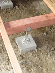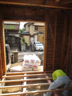 | 解体が終了し、基礎工事です。型枠にコンクリートを流し終わり養生期間をおきます。 | 大工さんが床の下地工事に着手しました。大引き・根太と順番に施工していきます。 | 当初束石はブロックで施工されていましたが、取り替えをして鋼製束でしっかりと木部を支持します。 |
