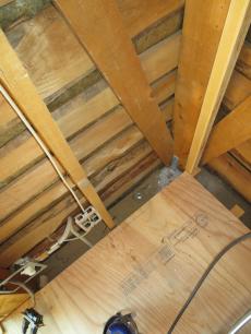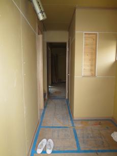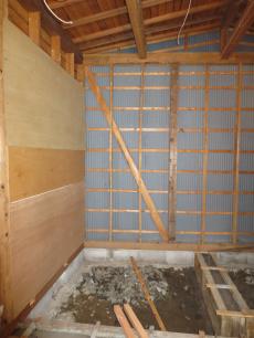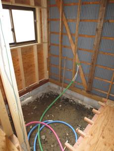 | この場所にユニットバスが設置されます。設置の前に給排水を新しく土間コンクリートを打ちます。 | 断熱材を下地の間にいれていきます。これで冬の寒さ対策も万全です。 | 大工さんも終盤です。石膏ボードを貼り、まわり縁、巾木を取付していきます。 |