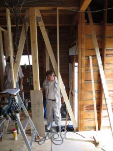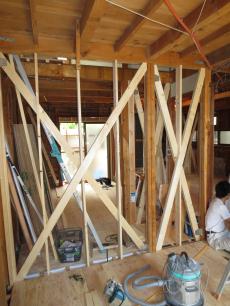 | 柱の引き抜き防止の為に金物を取り付けしまた。 | 現場監督の岸本が大工さんと打ち合わせをして、補強箇所の確認をしています。 | 間仕切り部分に筋交い、筋交いプレートを設置しました。これで構造補強も終わり内装の造作工事に入っていきます。 |