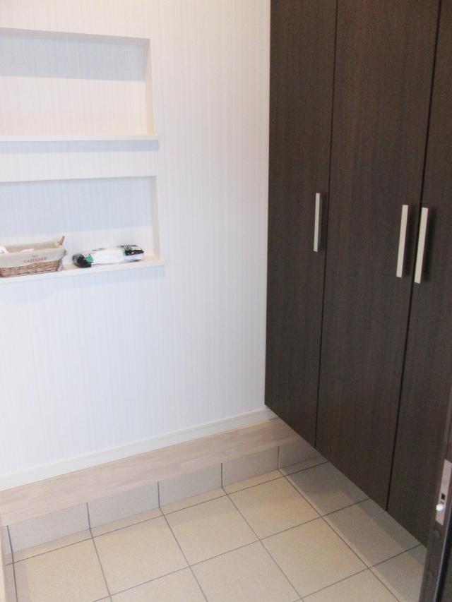 | 屋根材を瓦からカラーベストへ葺き替え軽量化をしました。外壁も弾性リシンの吹付けをおこない新築の装いとなりました。今回の屋根材はKMEWの『コロニアルグラッサ』を使用しました。 | 工事後の玄関です。白を基調したため、玄関収納はブラウンを使用し、アクセントをつけました。また、壁にはちょっとした小物を収納できるように、ニッチを作成しました。 |