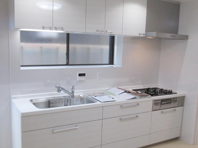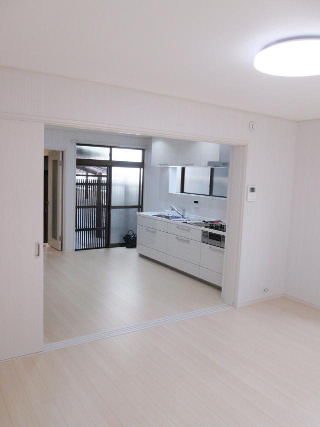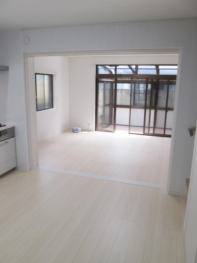 | 窓からの光が白い床に反射することにより、室内全体が明るく見えます。 | 工事後のキッチンです。キッチンはPanasonicの『リビングステーション Sクラス』を採用しました。壁や床との統一感を出すため、パネルは白としました。 |