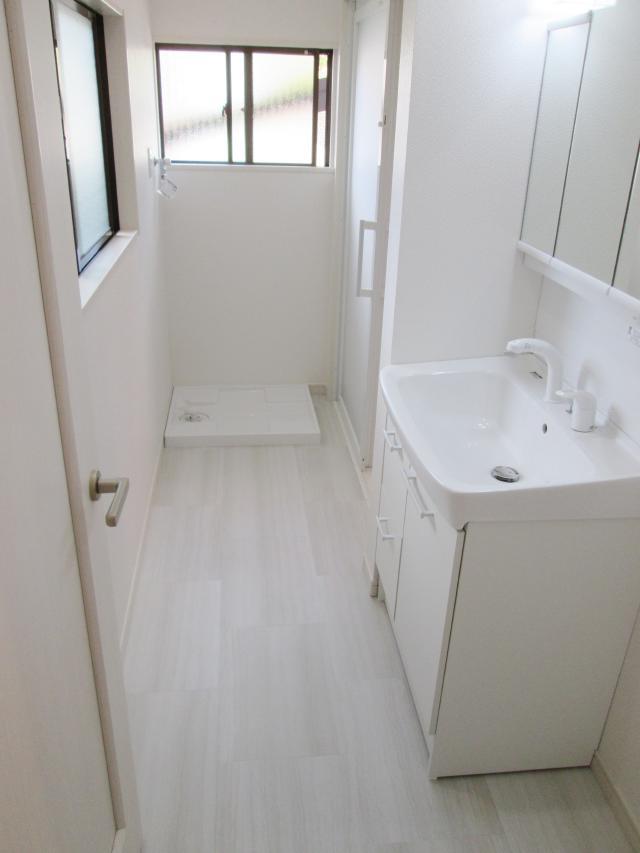 | 浴槽の向きを変更することにより、足をのばして入浴できるようになりました。使用したのは、TOTOの『サザナ』です。 | 洗面室も白にすることにより、明るく清潔感のある空間になりました。洗面化粧台はLIXILの『オフト』を採用しました。 |
