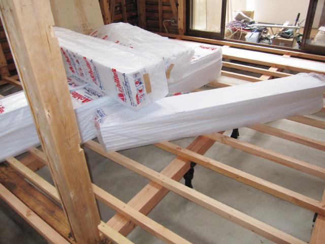 | 解体工事が終わると床下の土を漉き取って防湿シートを敷き詰め、その上からコンクリートを打設しました。 | 既存の配管を撤去し新設していきます。またその後床下地の根太を組んでいきます。 | 床下の断熱材が納品されました。これから根太の間に断熱材を敷設していきます。 |