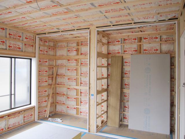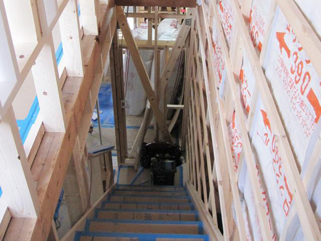 | 以前は壁にも断熱材が入っていなかった為、天井・壁に断熱材を充填していきます。これで夏は涼しく冬は暖かくすごすことができますね。 | 階段部分にもしっかりと断熱材を入れていきます。また、暗くなりがちな階段部分は2階の廊下部分の壁に小窓を付けることにより、明るくまたお洒落な空間に仕上げることができました。 | 石膏ボードを張り、巾木・廻縁を取付したらほぼ大工工事は完了です。これからクロス工事にはいっていき、工事も終盤になっていきます。 |