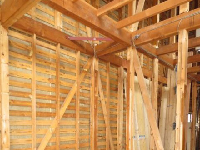 | 二階の梁組みを新設する部分への金物補強もしっかりと行います。 | 既存の筋交い部分も全て筋交いプレートを設置していきます。 | 既設の梁が細い部分に関しては梁を付けたし構造用合板で補強していきます。 |