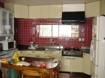| 施工前のキッチンです。食器棚と冷蔵庫がキッチンの左右にある分、部屋のスペースを圧迫しています。 |