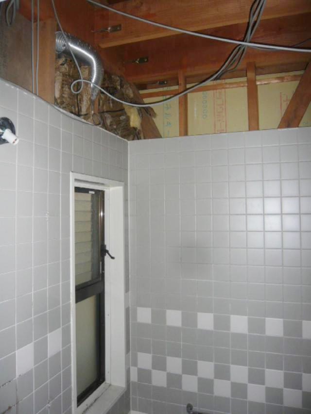 | 既存の給排水の配管を止水しています。これから解体工事スタートです。 | まずユニットバスの天井から解体工事がスタートしました。 | 配管工事が終わった後、サッシの入替え工事にかかっております。 |