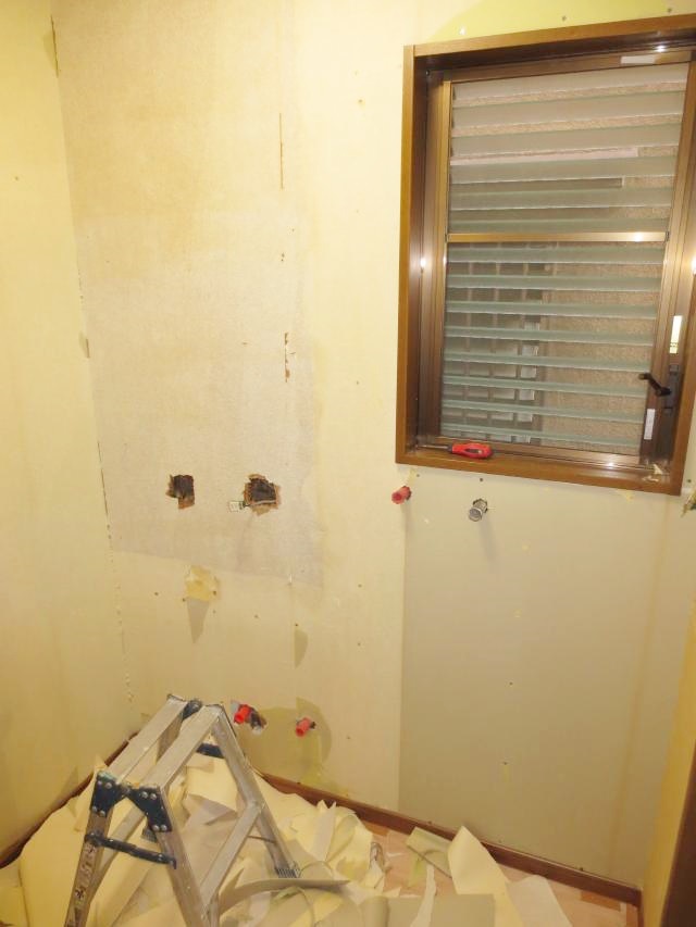 | ユニットバスが組みあがりました。これから洗面所内装→仕上げ工事へとかかっていきます。 | 洗面所の内装工事がはじまりました。まず既存のクロスを捲り、パテ処理をしてクロスを貼っていきます。 |