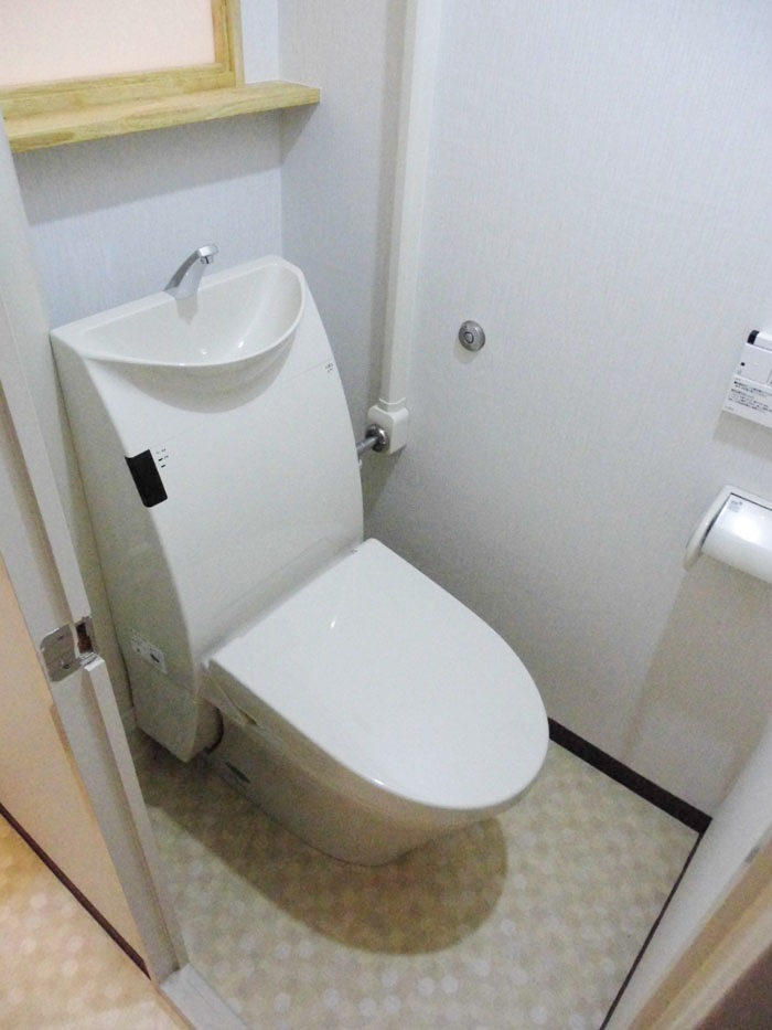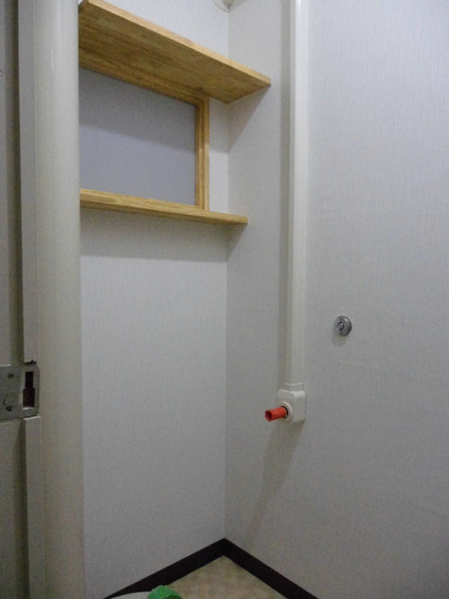| トイレの解体後です。この後床の下地を貼ります。 | 床の下地貼りが完了しました。この後、紙巻器の取り替えや便器の設置を行っていきます。 | クロスを張替え、造作棚の取付も完了しました。 |