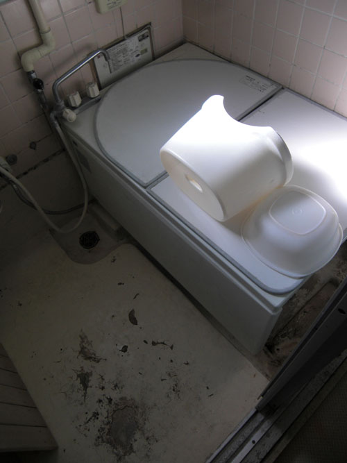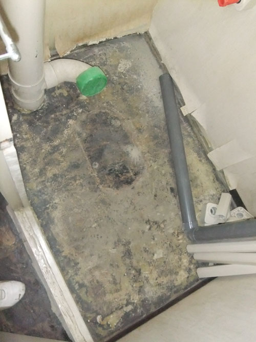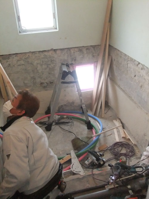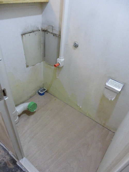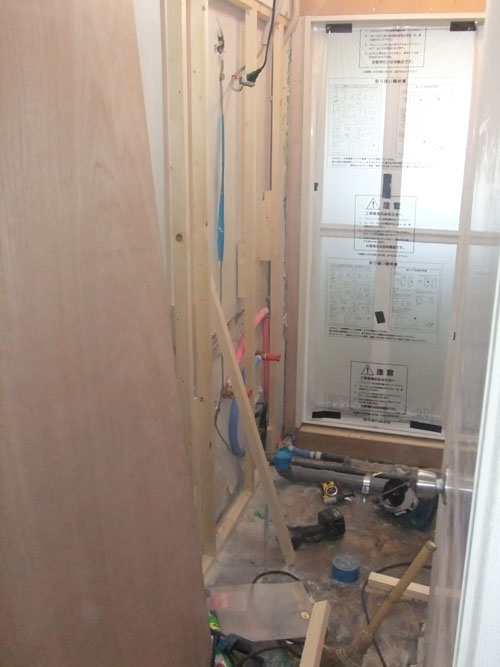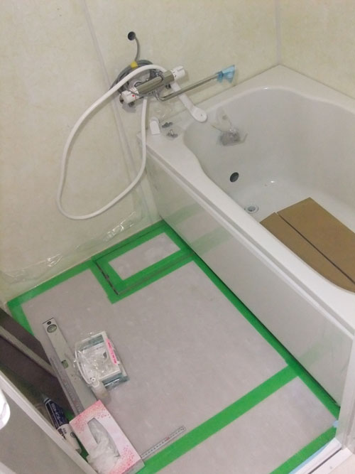 | 浴室です。壁パネルと浴槽の設置が終了しました。後は養生を外すのみです。 | 洗面室です。壁取り付け型の洗面をこれから外し、同様に壁と床も解体します。 | 洗面室です。床を剥がし、配管の位置を確認します。 |