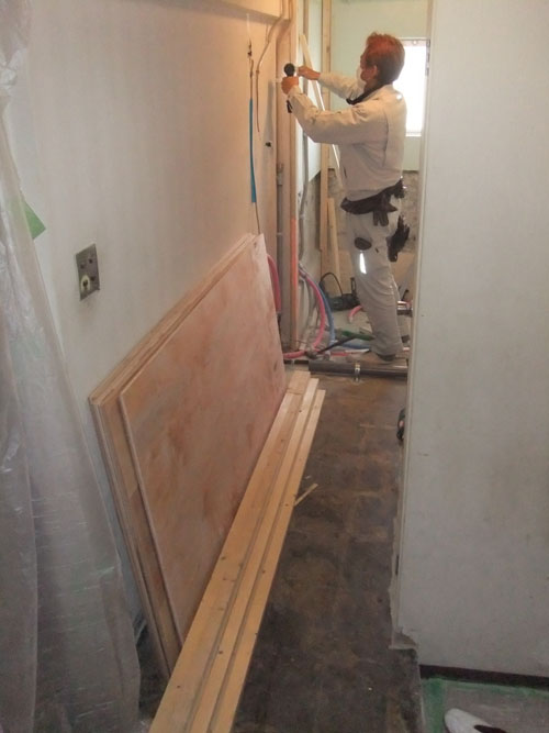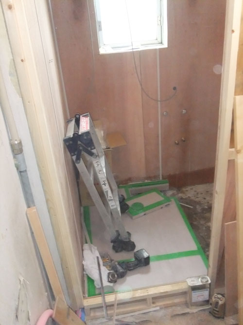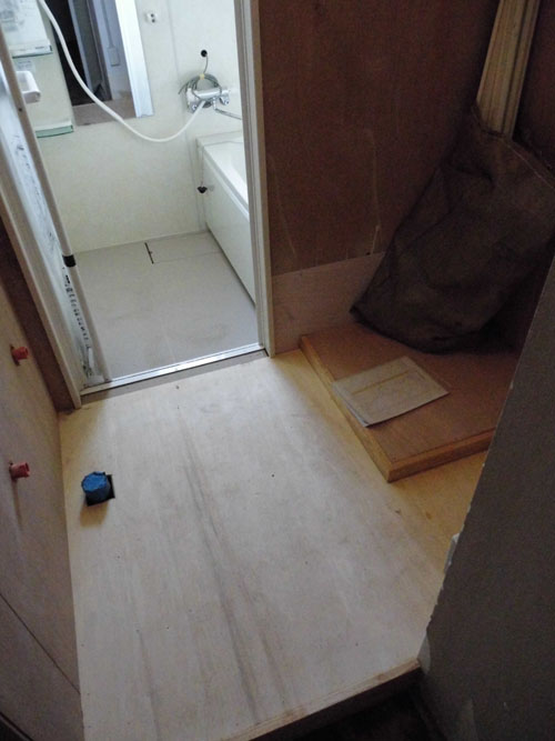| 洗面室です。洗面台に合うように木の枠を新設します。 | この後、天井に塗装を施すので、汚れないよう浴槽ドアなどまわりを養生します。 | 壁と床の下地貼りが完了しました。あとは、クッションフロアを貼って洗面台の配管設置と洗面台本体の取付で完了です。 |
