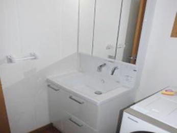 | 大きい3面鏡のある洗面台を設置し洗面スペースも広くなりました。 |