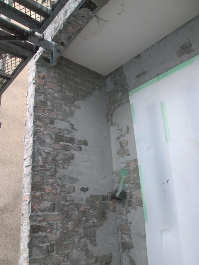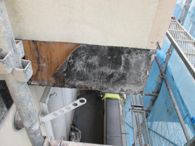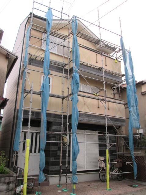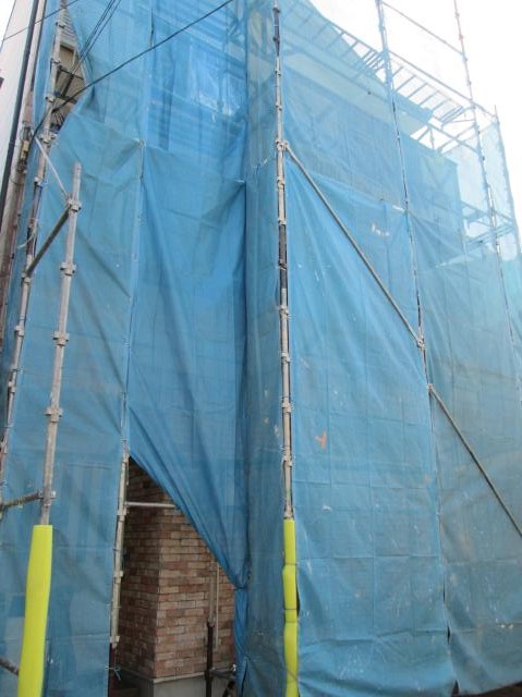 | 足場を組立てます。解体中に破片が飛び散らないようにメッシュシートで覆います。 | 玄関ドアやサッシ等を傷つけないように養生をしっかりした上でタイルを解体していきます。 | 下地材とタイルの間の防水シートも劣化していました。 |
