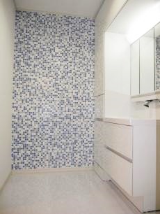 | こちらは納戸です。壁一面にパイプハンガーを設置しました。また壁にログパインを貼り調湿効果を高め大切なお洋服を守ります。 | 洗面台はシンプルで美しいデザインのLIXIL『エルシィMセレクション』です。上部と側面の収納がたっぷりです。 | お風呂のイメージに合わせて洗面室の壁には職人さんに配色を考えてタイルを貼ってもらいました。 |