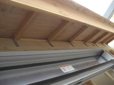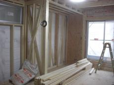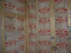 | 柱と柱の間にクロスに筋交いを入れて、耐震性を高めます。 | 必要な部分はしっかり金物で留めていきます。 | 断熱工事です。下から上までしっかり敷き詰めることで、断熱効果がでます。 |