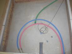 | 屋根裏部分にも断熱ボードを敷き詰めて、暖かいお家になるようにします。 | 水道工事、ガス工事です。 | 電気工事です。お客様と事前にコンセントの位置などを打ち合わせで決定します。 |