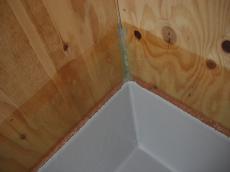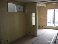 | LDKの施工中です。お客様の希望で飾り棚を造作しています。 | バルコニー部分の防水下地を施工しています。 |