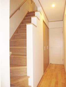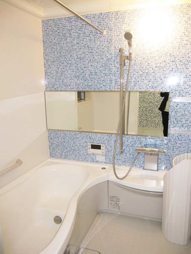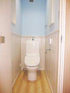 | 浴室はトクラスの『リベロ』です。人間工学に基づいたエルゴデザインバスタブで体に優しい形です。壁のデザインパネルは標準です。 | トイレも海をイメージして爽やかに仕上げました。壁に埋め込みで収納棚を造りました。 | 壁を階段状にして、空間を広く見せます。また、手すりがわりにもなり安全です。 |