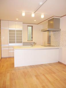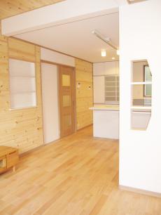 | キッチンはパナソニックの『リビングステーションNEW Sクラス』です。壁にタイルを貼って可愛らしい空間になりました。 | LDKです。壁に飾り棚を造って開放的な空間にしました。また、壁にはログパイン材、天井にはパイン材を貼りました。 | LDKです。木の温もりたっぷりの空間に仕上げました。内装ドアはパナソニックを採用しました。 |