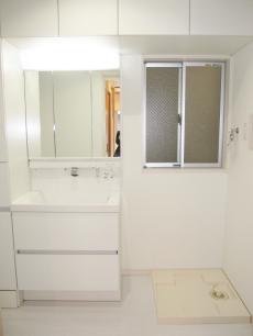 | こちらは納戸です。壁一面にパイプハンガーを設置しました。また壁にログパインを貼り調湿効果を高め大切なお洋服を守ります。 | 洗面台はシンプルで美しいデザインのLIXIL『エルシィMセレクション』です。上部と側面の収納がたっぷりです。 | お風呂のイメージに合わせて洗面室の壁には職人さんに配色を考えてタイルを貼ってもらいました。 |